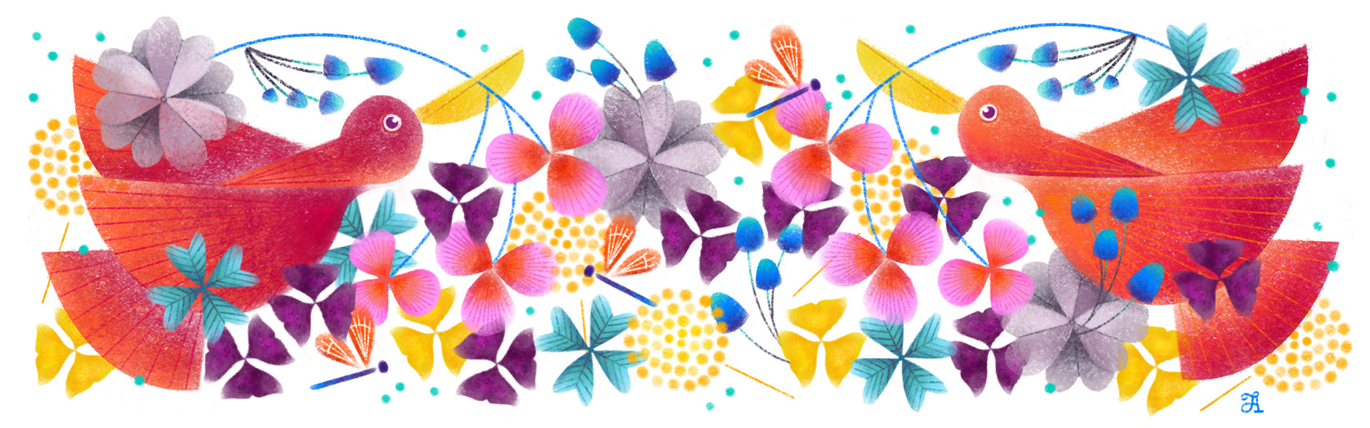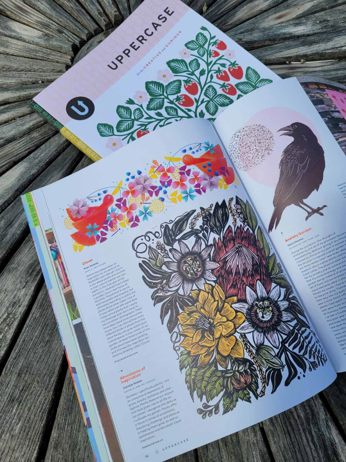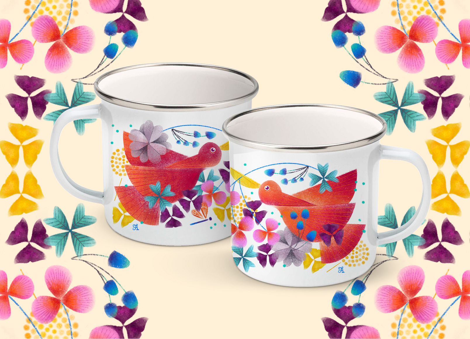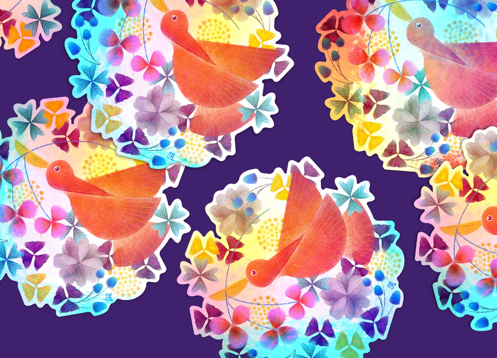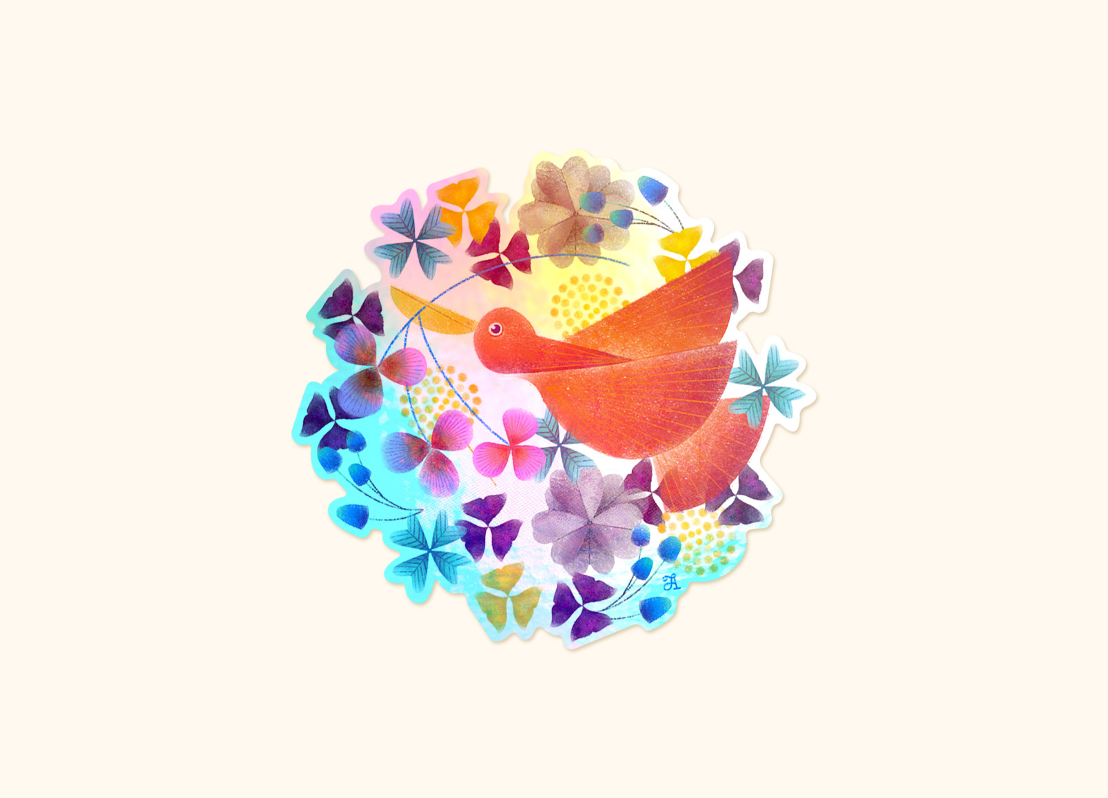 A drawing inspired by the many shapes, colors, and leaf patterns of the different Oxalis species. Printed on 12oz enamel mugs and oil slick holographic stickers.