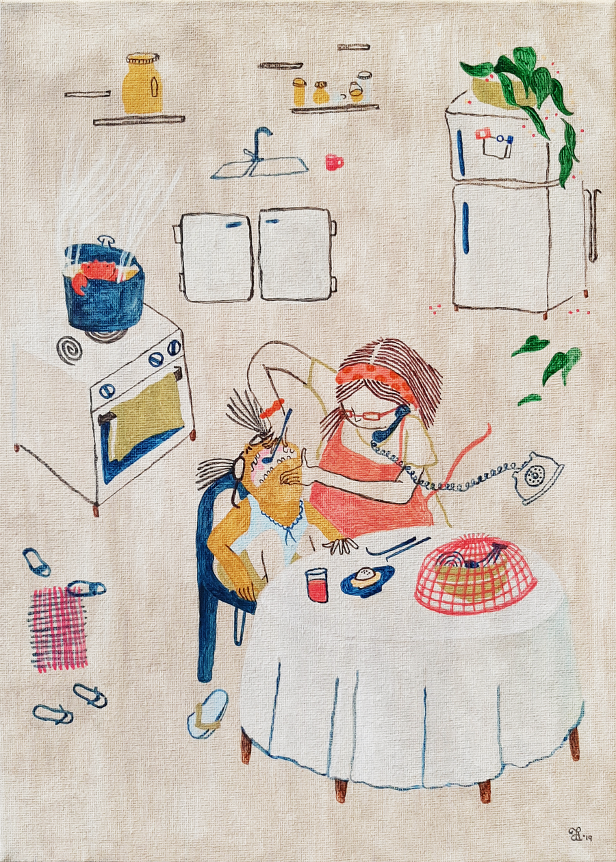 Painting for Ang Ilustrador ng Kabataan's group exhibit about childhood stories. Mine is about how my mother who's a dentist used to give me dental check-ups in the kitchen.
