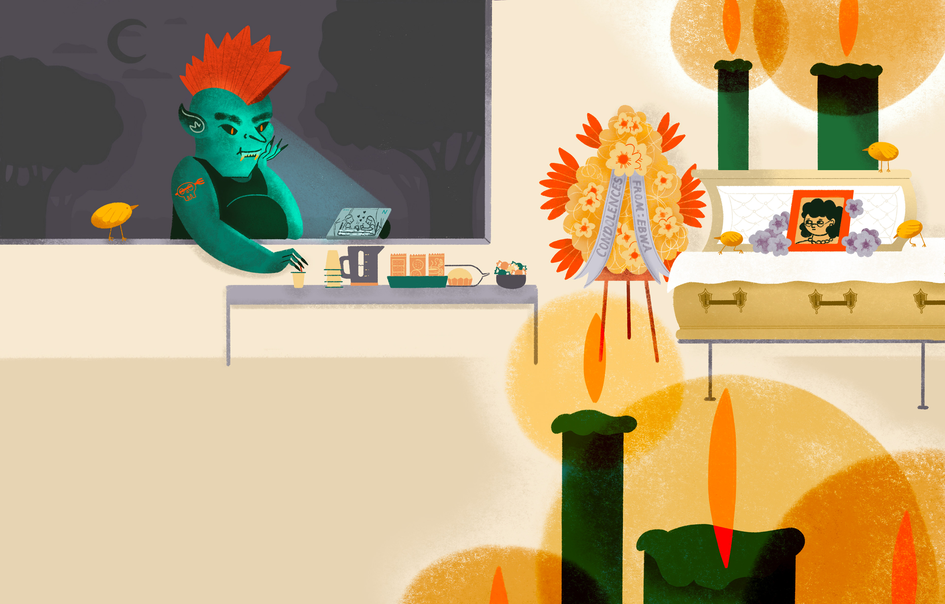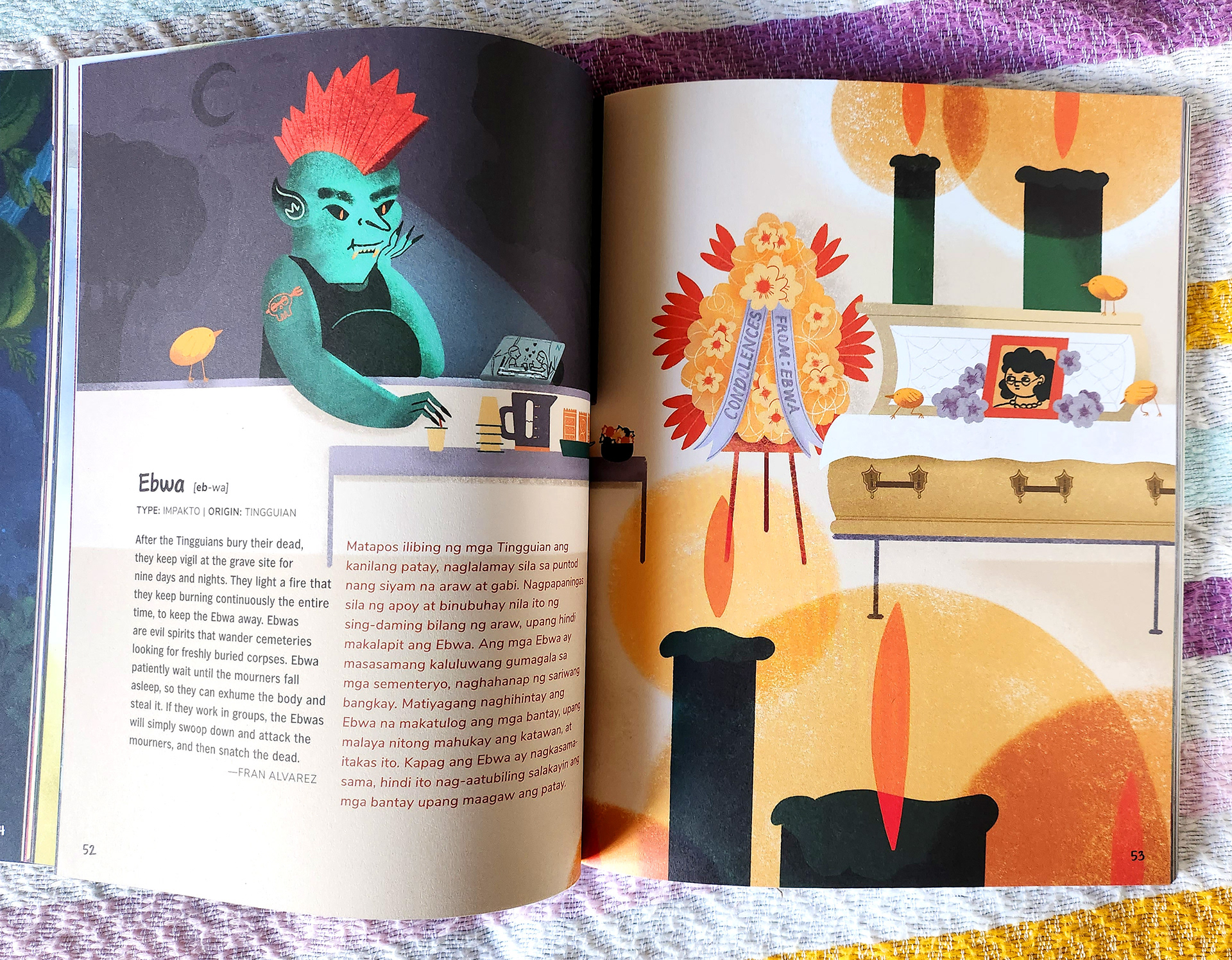 The overall theme of the book was to depict how the creatures integrate themselves in modern times, and how they might adapt to some urban situations. The creatures I illustrated were the Ebwa (a corpse-eating ghoul who waits for mourners to fall asleep so he can steal corpses) and the Pugot (a decapitated creature who likes to mess with the suitors of the women he takes an interest in).
