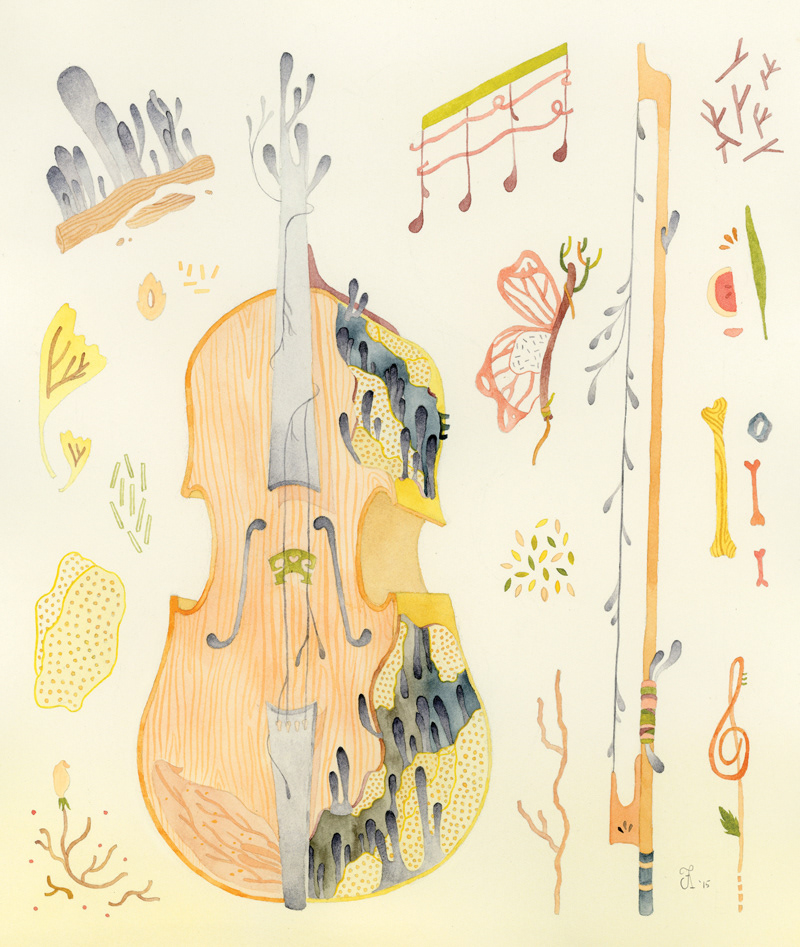Painting for the GUTS exhibit at Light Grey Art Lab in Minneapolis. The artwork is inspired by vintage educational charts, based on how inexpensive violins can be treated with fungi to make them sound like a Stradivarius.